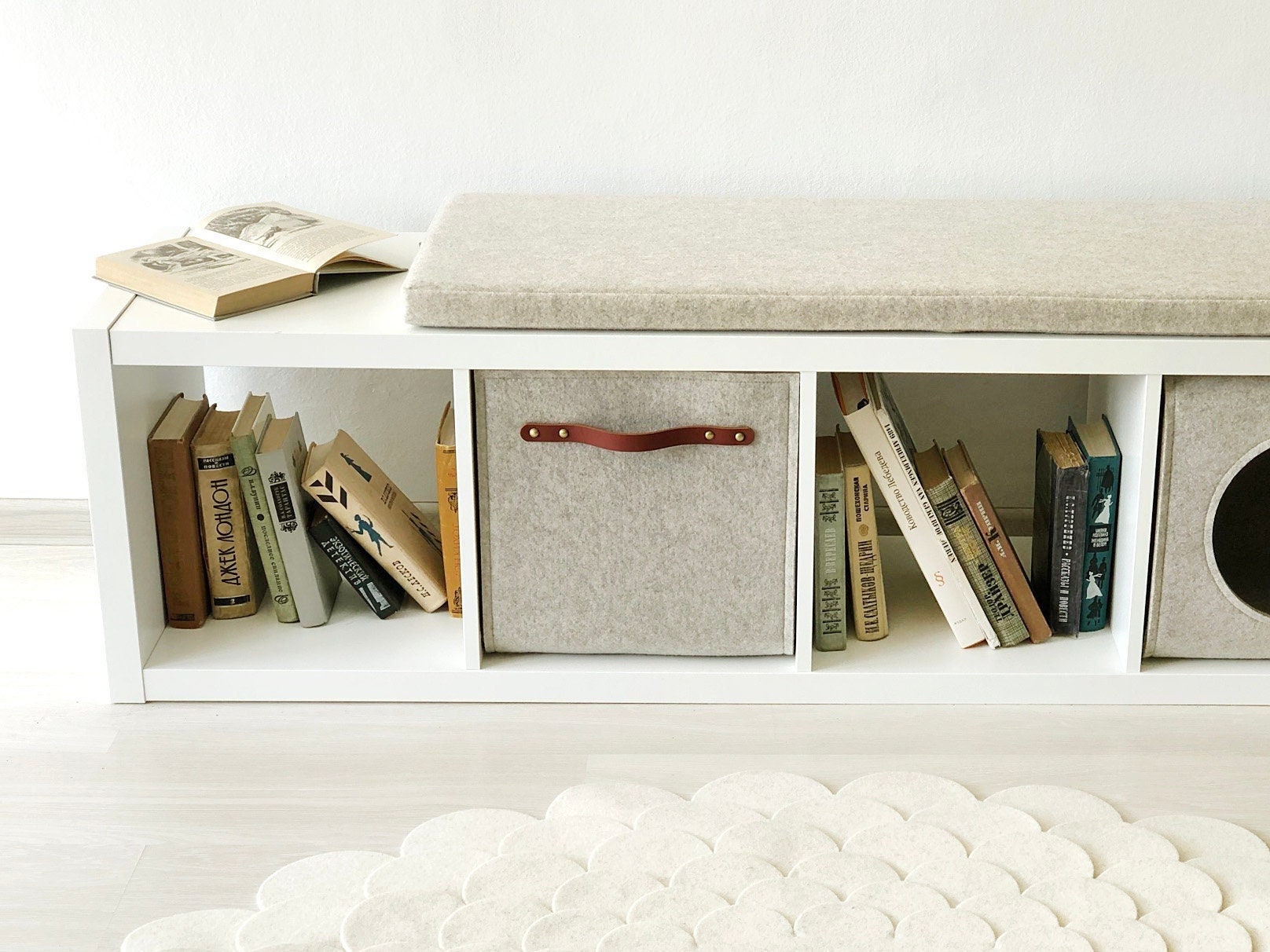 The felt box fits perfectly into Ikea Expedit, Kallax and lots of other shelves.